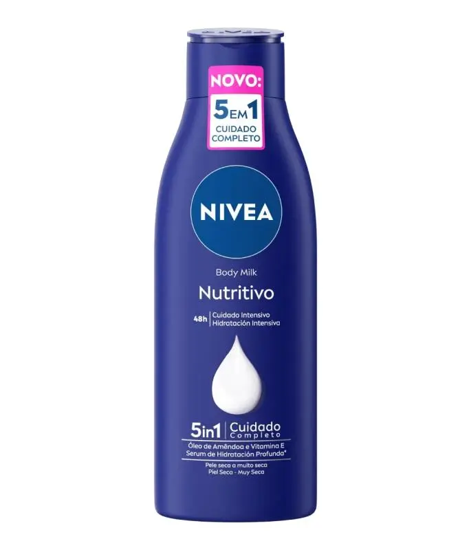 Transforme a sua pele seca com leite corporal nutritivo NIVEA. Proporcionando cuidados completos 5em1, esta fórmula rica e cremosa não é gordurosa e fornece 48h de hidratação profunda, proteção seca, uma sensação de pele suave e pele saudável.